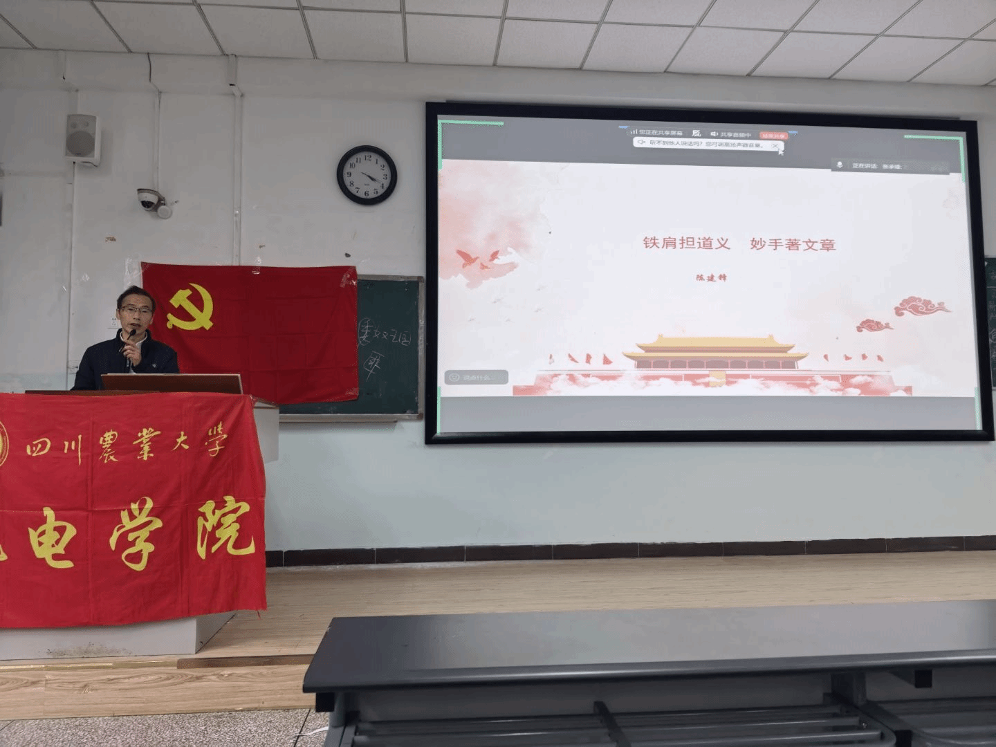 12月2日,机电学院第十一期团校第三讲暨第九期青马班第二讲在10教A301、A302举行。本次培训主题为红色“12.9”相关知识讲座,由陈建锋老师主讲,各部门成员、学院团干参与。培训中,陈建锋老师围绕“12.9”运动爱国精神,紧扣“铁肩担道义,妙手著文章”的精神传承,从《新青年》点燃青春理想,到“12.9“运动爱国精神的燎原,引导川农学子将爱国情怀融入实际行动,担当时代使命。(图1陈建锋讲解红色“12.9”精神 图/周旭)(图2 陈件锋讲解《...