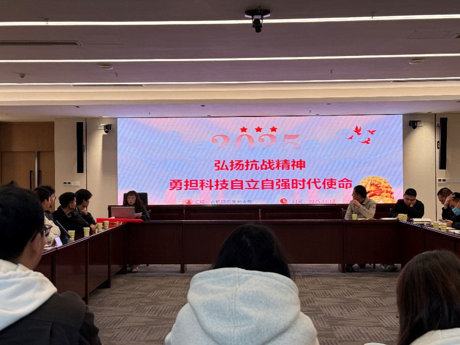 在综合体会议室,三党支部联合召开主题研讨。会上,机电学院农电研究生党支部书记王玉雪以《烽火到智造,红魂筑自强》为题,梳理了抗战精神与科技自立自强的内在关联;农机研究生党支部书记肖梁辉以《红色文化融入智能制造创新实践》为题,结合农业机械研发案例,阐述了红色精神在科研中的实践路径;农机研究生党支部林祖香以《弘扬抗战精神 勇担科技自立自强时代使命》为题,表达了青年学子扎根农业科技的决心。