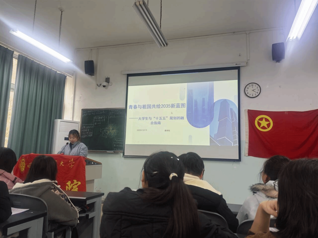12月19日,机电学院第十一期团校第四讲暨第九期青马班第三讲在第一教学楼406教室开讲。唐诗怡老师主讲,学院各部门成员、团学骨干及青马班学员参与,旨在引导青年将个人成长与国家发展紧密对接。
